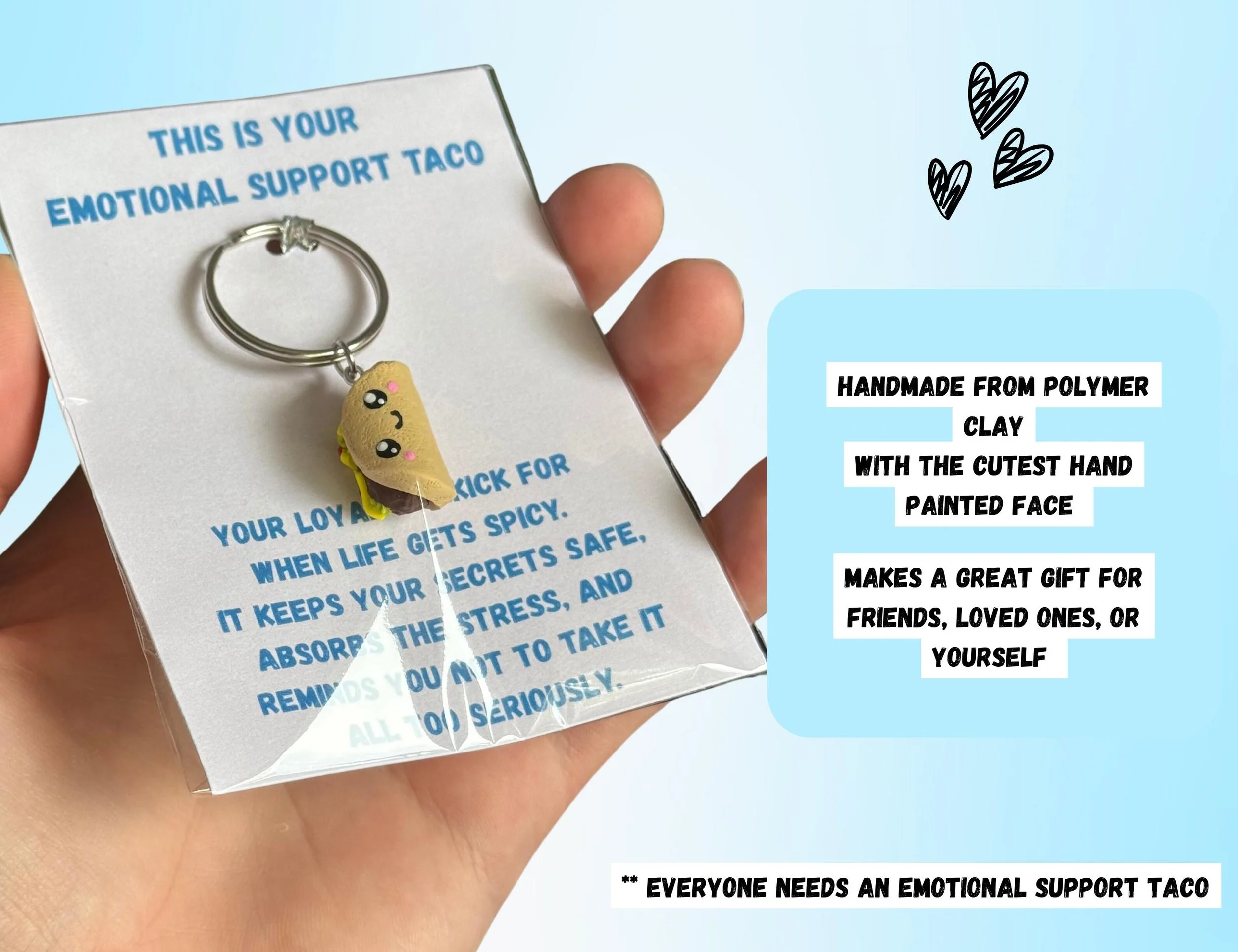 This handmade polymer clay taco keychain comes with an adorable hand-painted face to cheer you up wherever you go. Each one is packaged on a printed backing card with a sweet introduction to your new companion — making it perfect for gifting or keeping as your own pocket-sized pick-me-up.